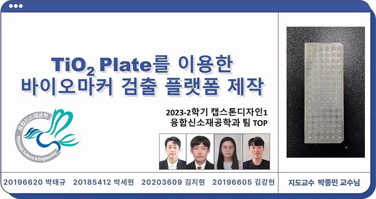2023년 12월 5일 교내에서 개최된 2023학년도 2학기 캡스톤디자인 경진대회에서 박종민 교수가 지도한 융합신소재공학전공 캡스톤디자인1 TOP팀 (팀장: 박태규, 팀원: 김강현, 김지현, 박세현)이 “TiO2 plate를 이용한 바이오마커 검출 플랫폼 제작”으로 금상을 수상하였습니다.
