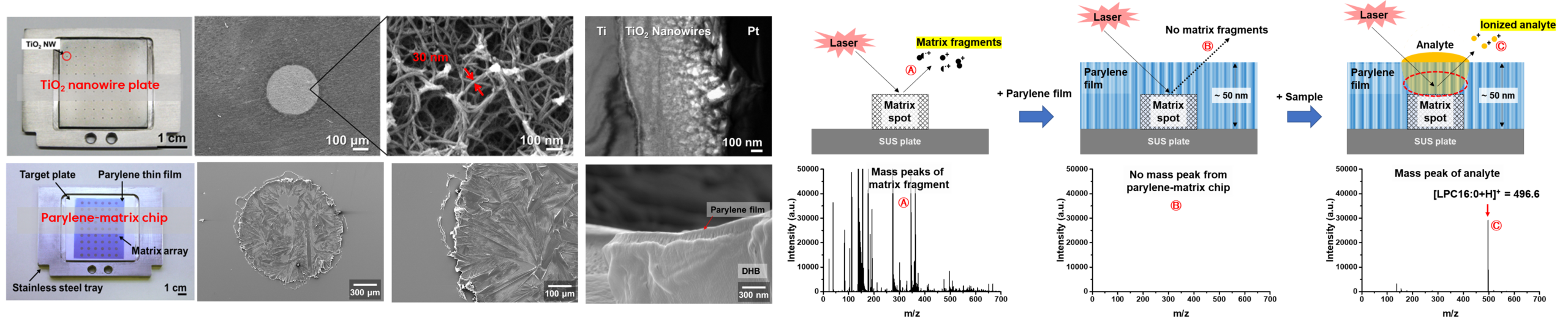 ○ Nanostructured solid matrix chips including parylene-matrix chip and TiO2 nanowire chip for:
